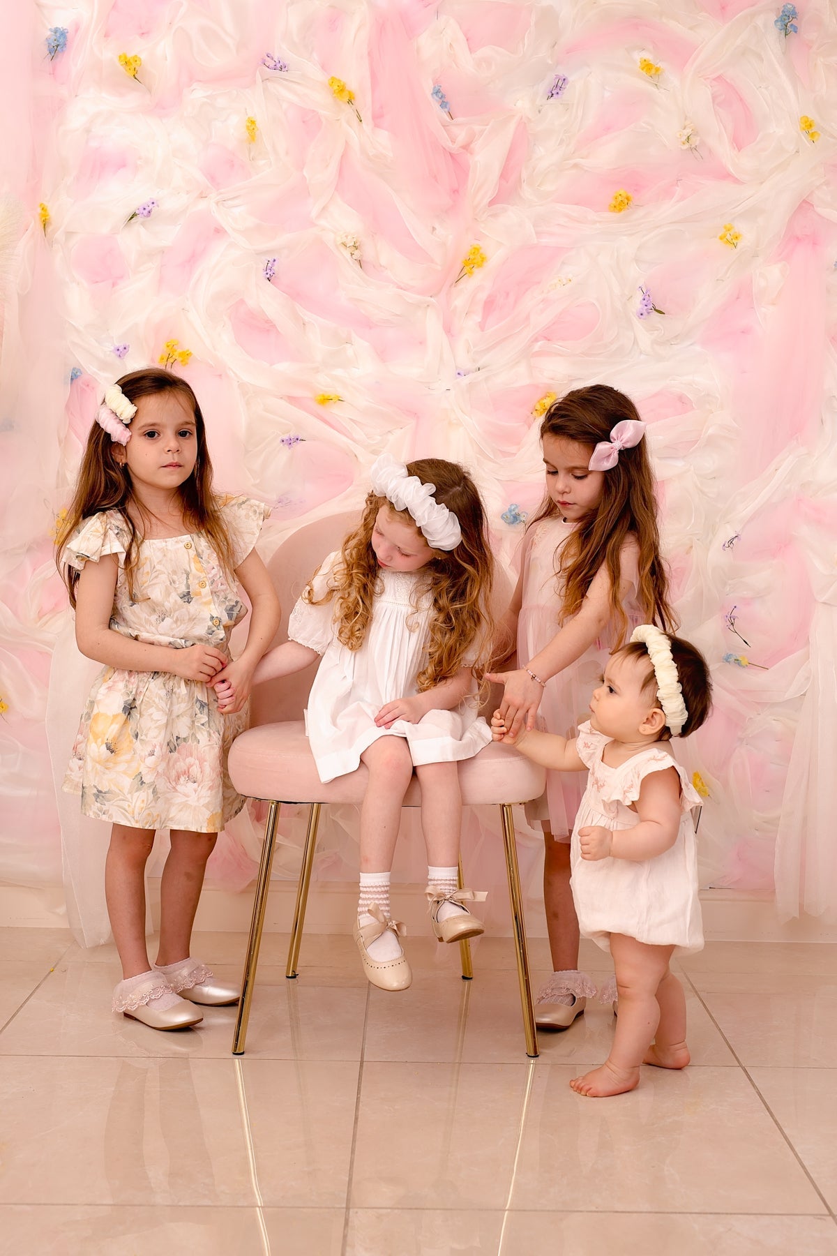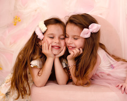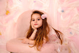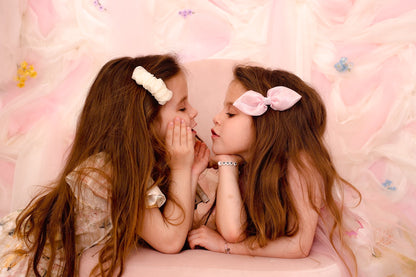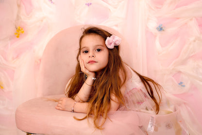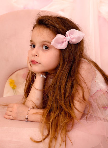 This is a brand new bow shape we added this season. We made it in 2 different fabrics: a beatiful embroidered/tulle and also this organza fabric. The beaded center ties the whole look together so beautifully! Wear it as a hair bow or as a bowtie! Size: About 5.5" wide.