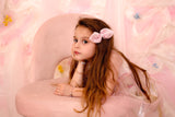 This is a brand new bow shape we added this season. We made it in 2 different fabrics: a beatiful embroidered/tulle and also this organza fabric. The beaded center ties the whole look together so beautifully! Wear it as a hair bow or as a bowtie! Size: About 5.5" wide.