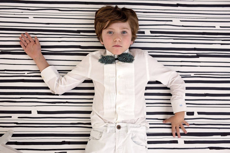 Feather bowtie with ribbon in the center, it can be worn as a clip for girls too.