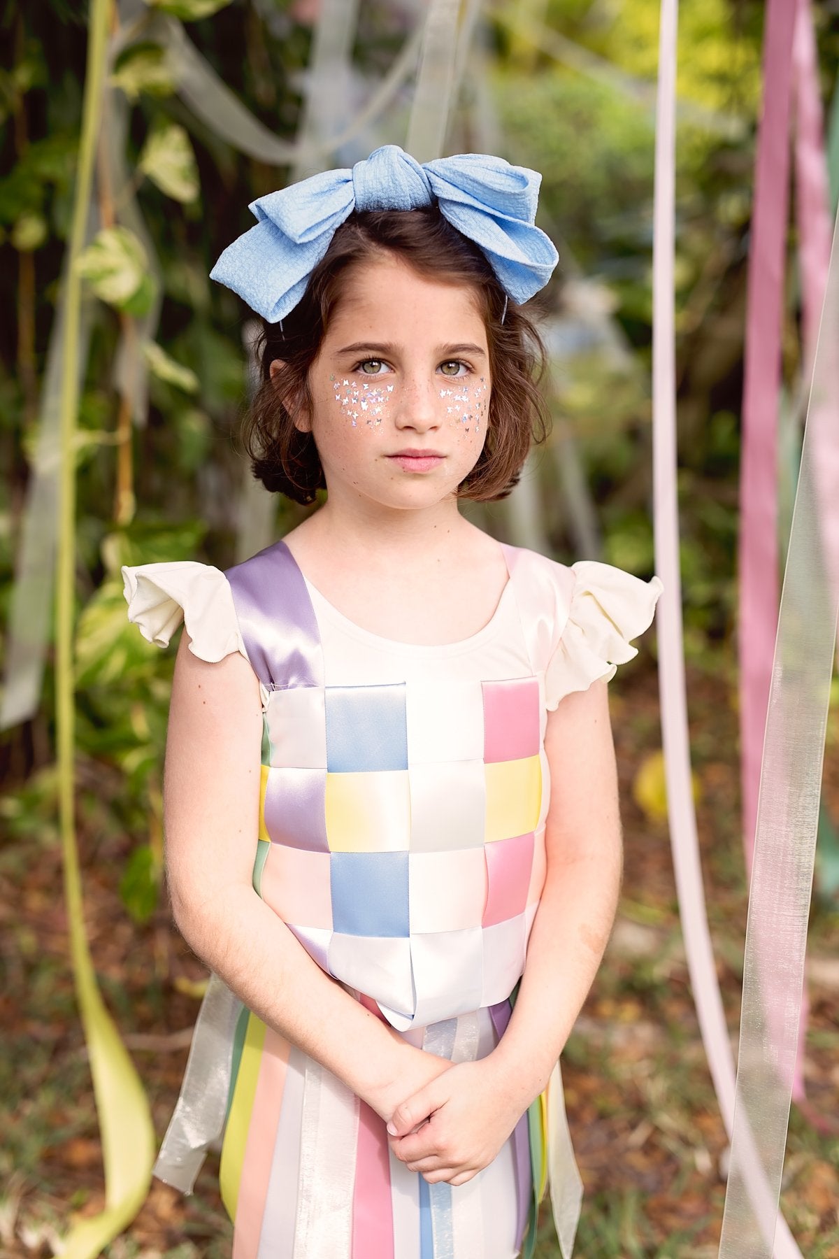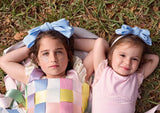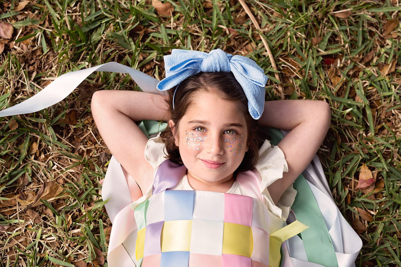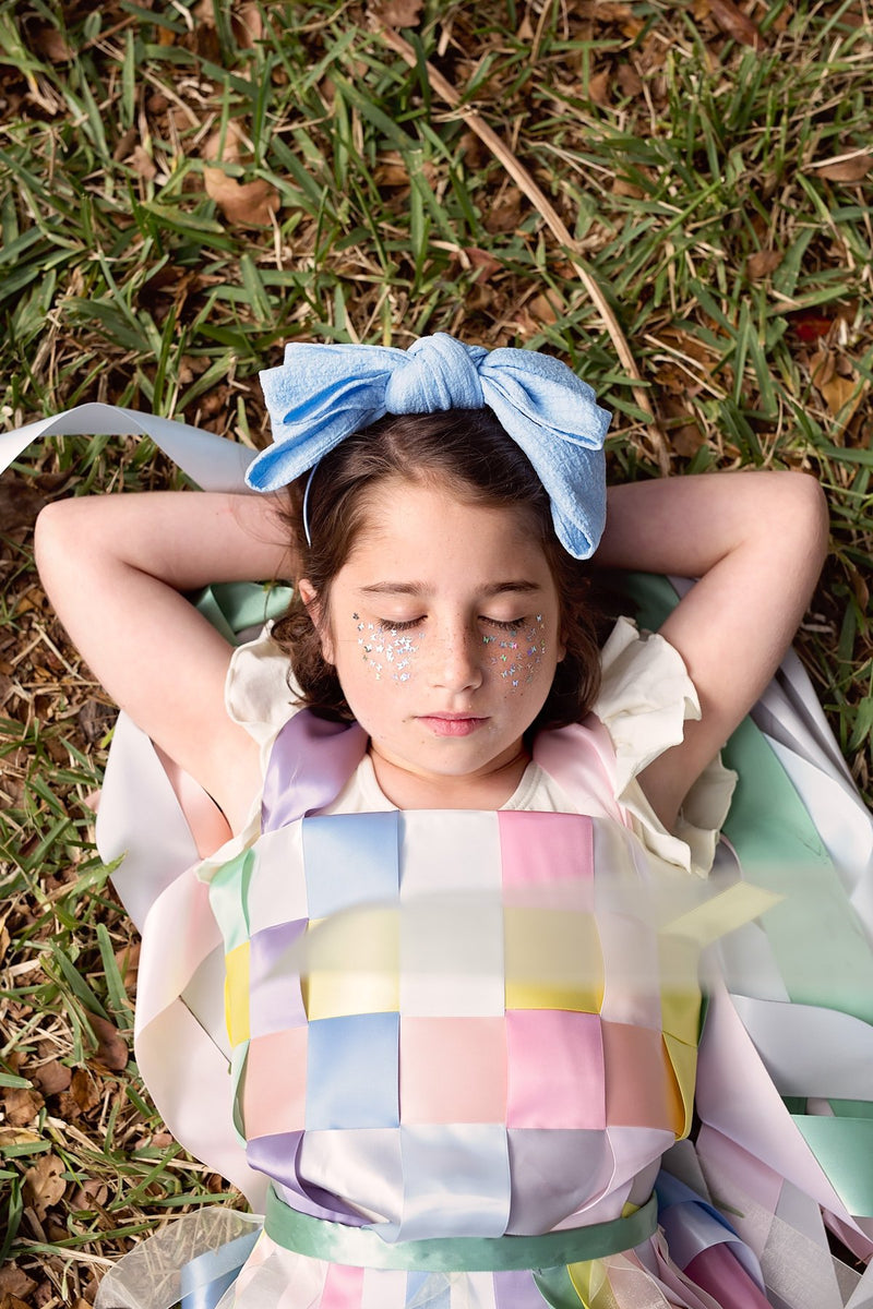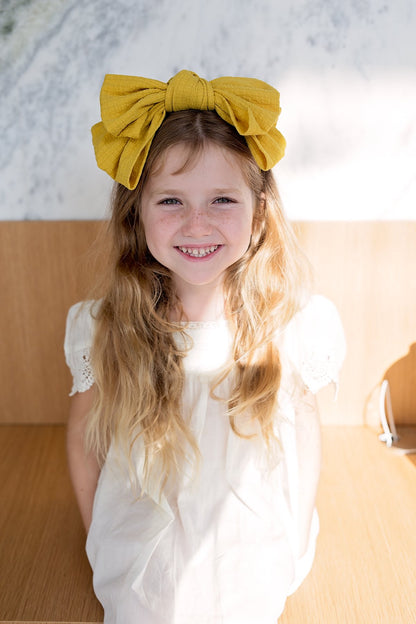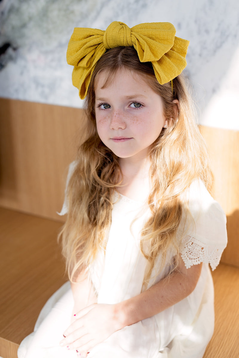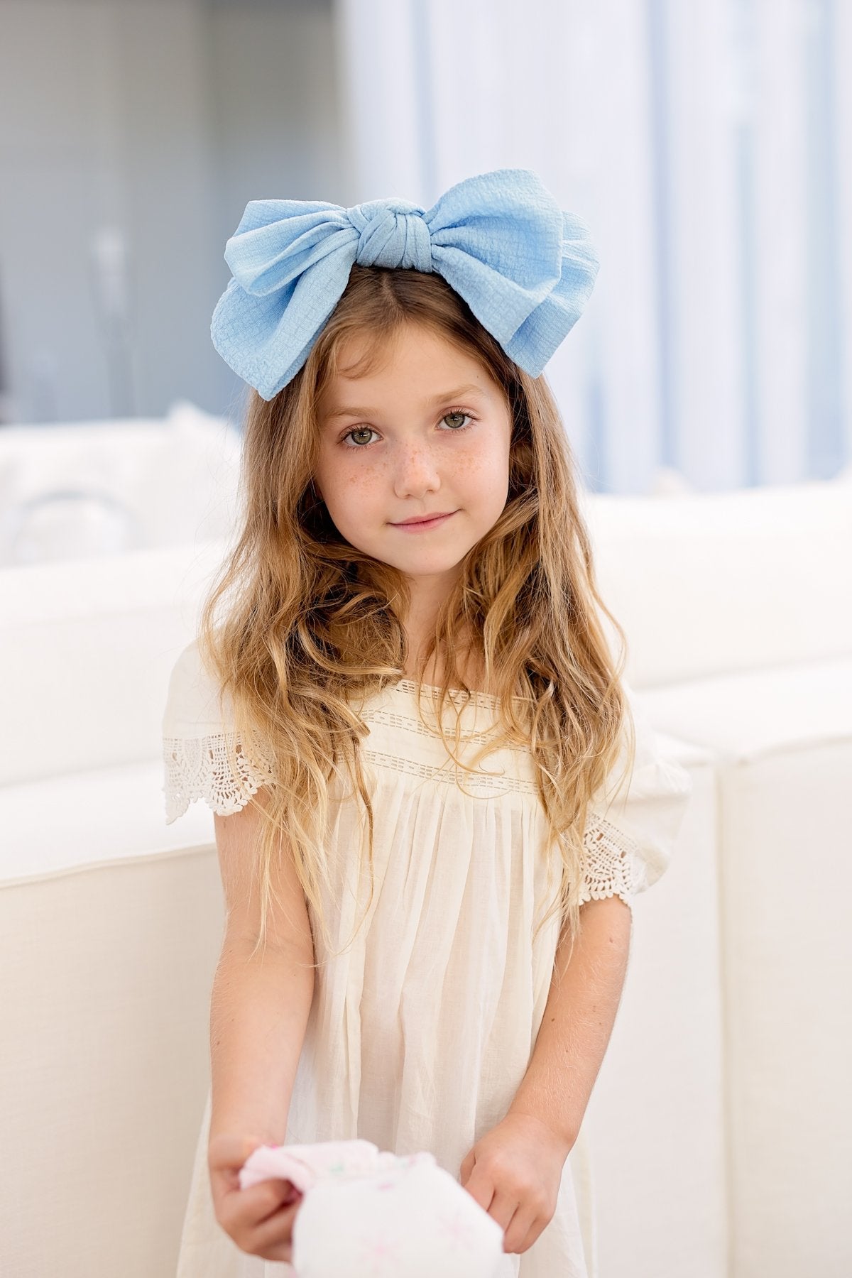 Folded Layers of muslin gauze forming an oversized bow on a hard headband.