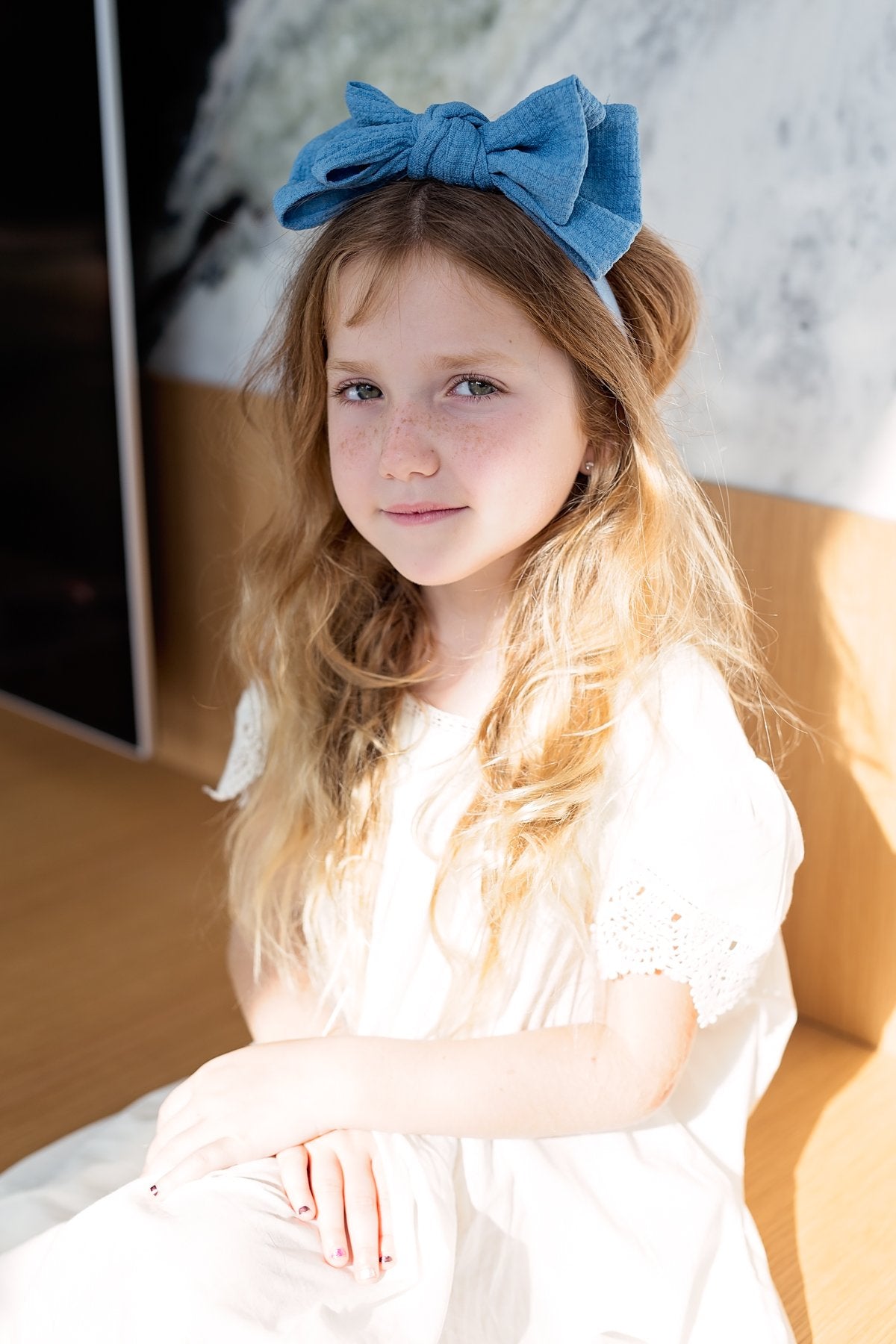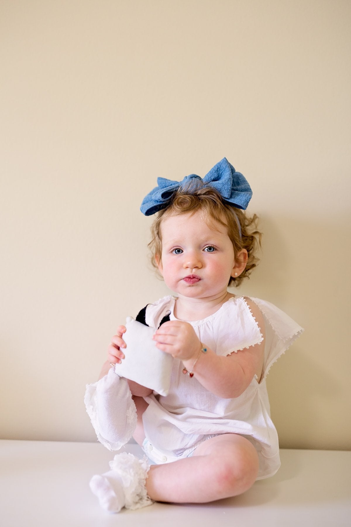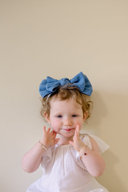 Folded Layers of muslin gauze forming a bow on an adjustable wrap.
