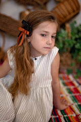 Scalloped edged grosgrain ribbon created a double looped bow with dangling ribbon. Each loop is made with three layers of ribbon. Comes on an alligator clip. Size is about 3.5".