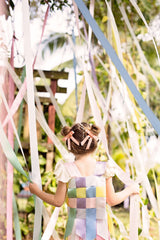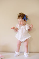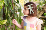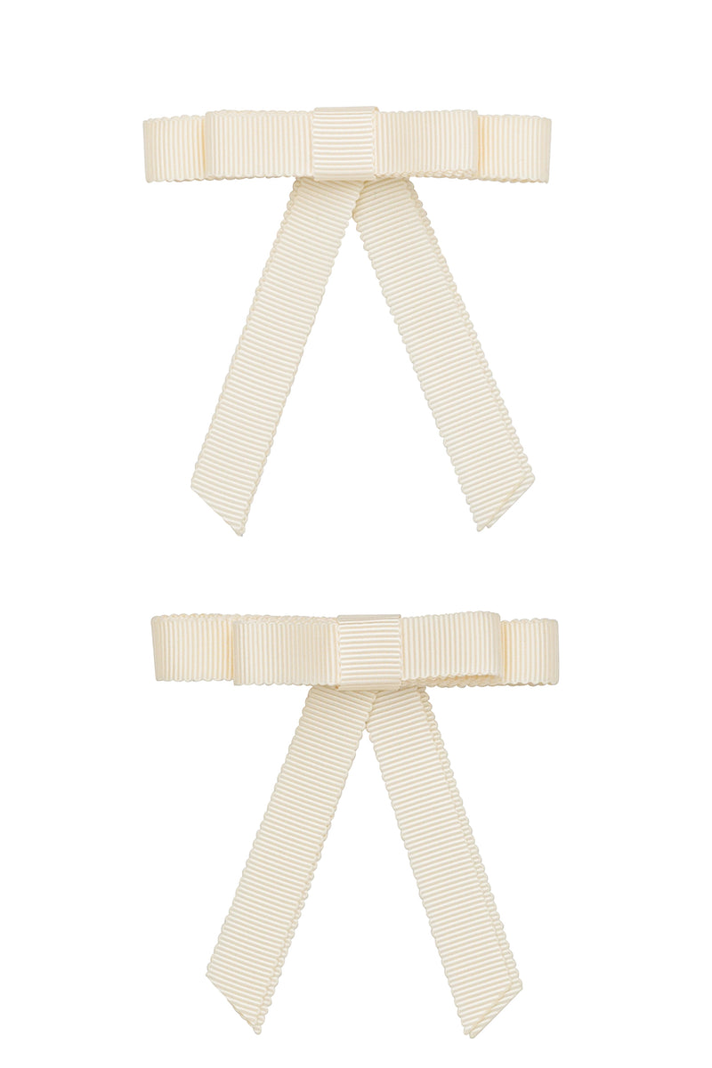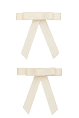 Scalloped edged grosgrain ribbon created a double looped bow with dangling ribbon. Each loop is made with three layers of ribbon. Comes on an alligator clip. Size is about 3.5".