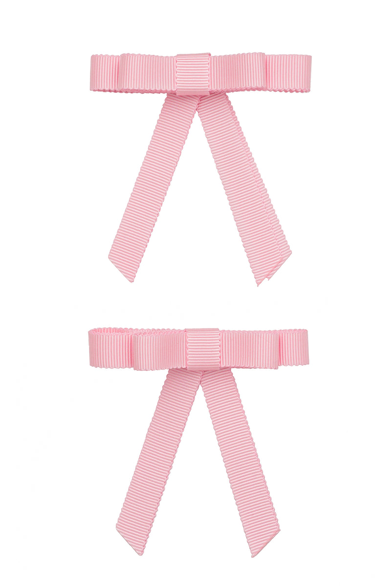Scalloped edged grosgrain ribbon created a double looped bow with dangling ribbon. Each loop is made with three layers of ribbon. Comes on an alligator clip. Size is about 3.5".