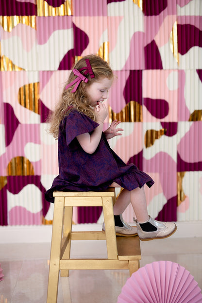Scalloped edged grosgrain ribbon created a double looped bow with dangling ribbon. Each loop is made with three layers of ribbon. Comes on an alligator clip. Size is about 3.5".
