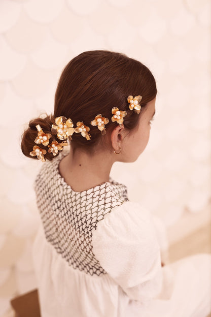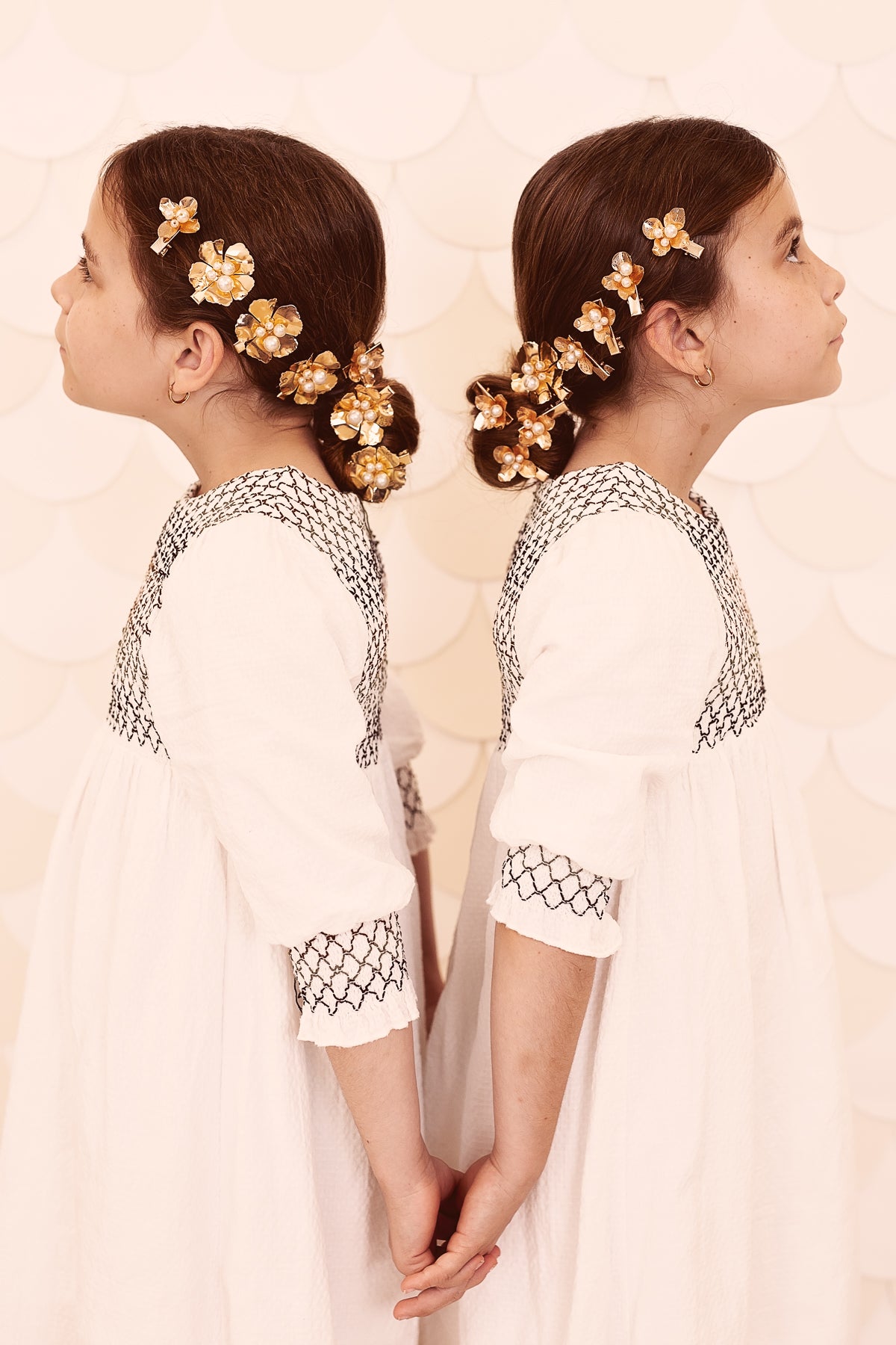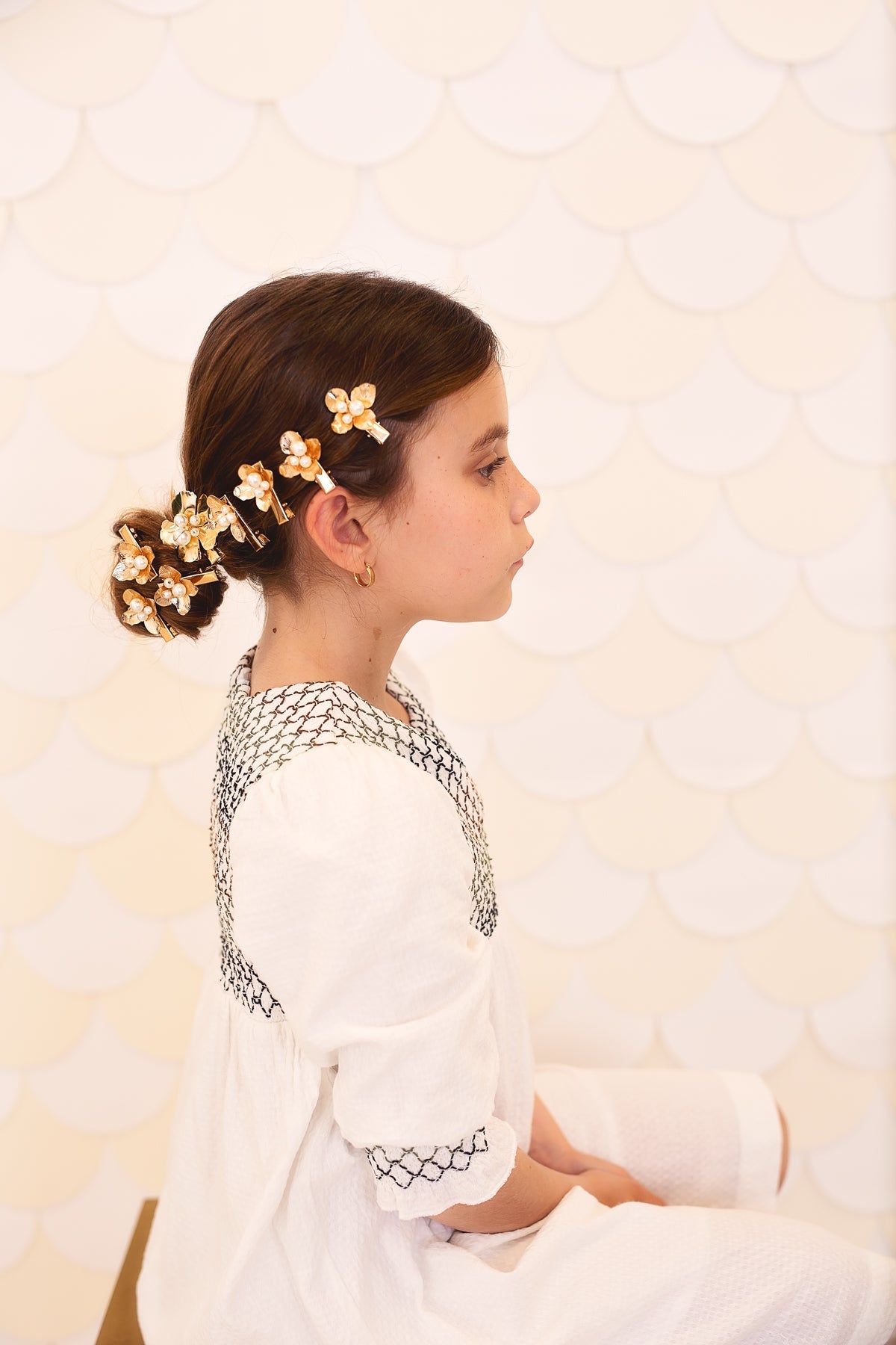 Delicate, elegant, and beautifully detailed—these floral clips add a touch of charm to any hairstyle. Featuring sculpted hibiscus petals in a radiant gold finish, each clip is adorned with a cluster of luminous pearls at the center for a soft, refined look.