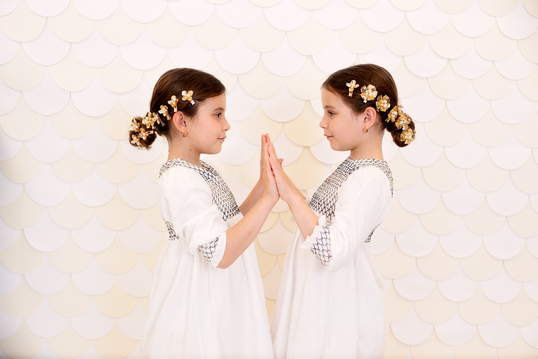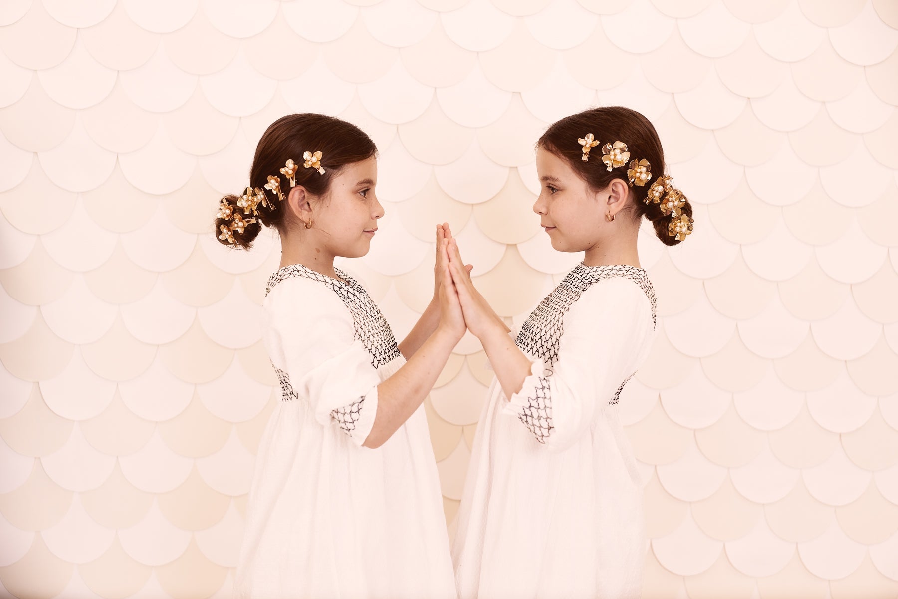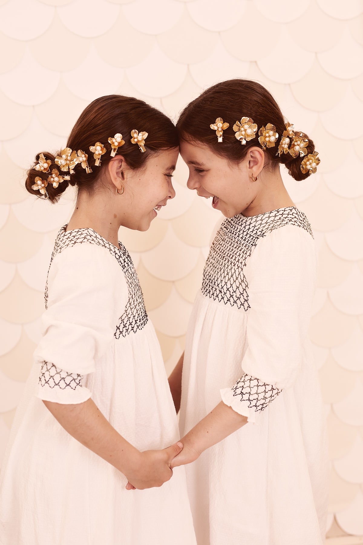 Delicate, elegant, and beautifully detailed—these floral clips add a touch of charm to any hairstyle. Featuring sculpted hibiscus petals in a radiant gold finish, each clip is adorned with a cluster of luminous pearls at the center for a soft, refined look.