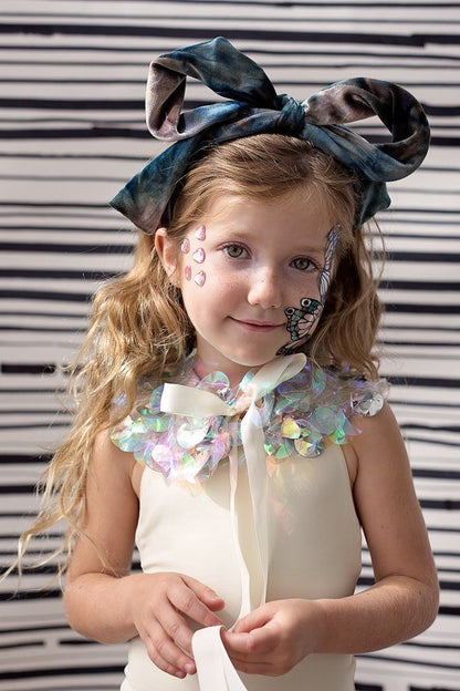 Project 6 kids love collars, they are the perfect addition to any coat or dress. The Ivy collar comes with 2 closure options, cotton ribbon or satin ribbon and can be self tied. The collar has hand sewn crushed (to add dimension and reflections) colorful discs that adds a perfect sparkle!