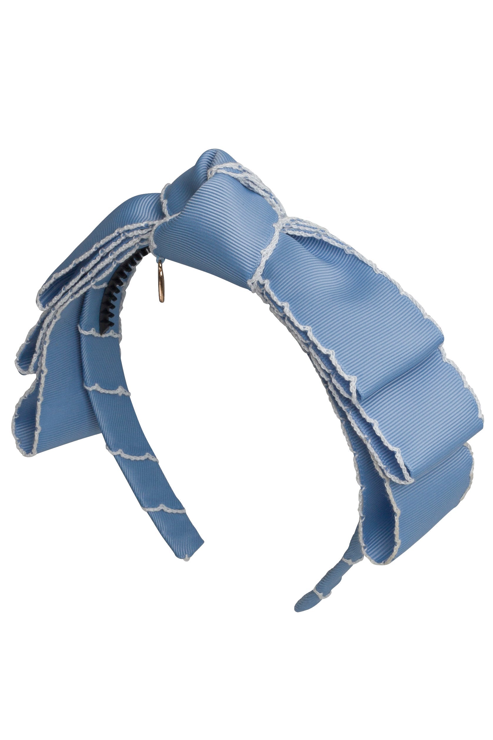This headband brings together two beloved designs—the structured layers of our Heather Headband and the effortless elegance of a classic knot. Made from grosgrain ribbon with delicate moon-stitched edging, it features a a triple layer bow with a knot at its center.
