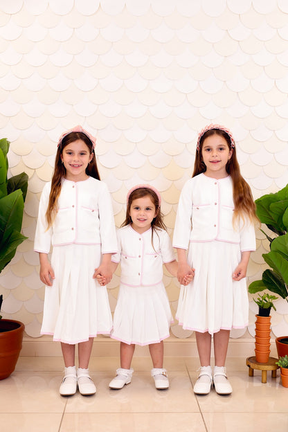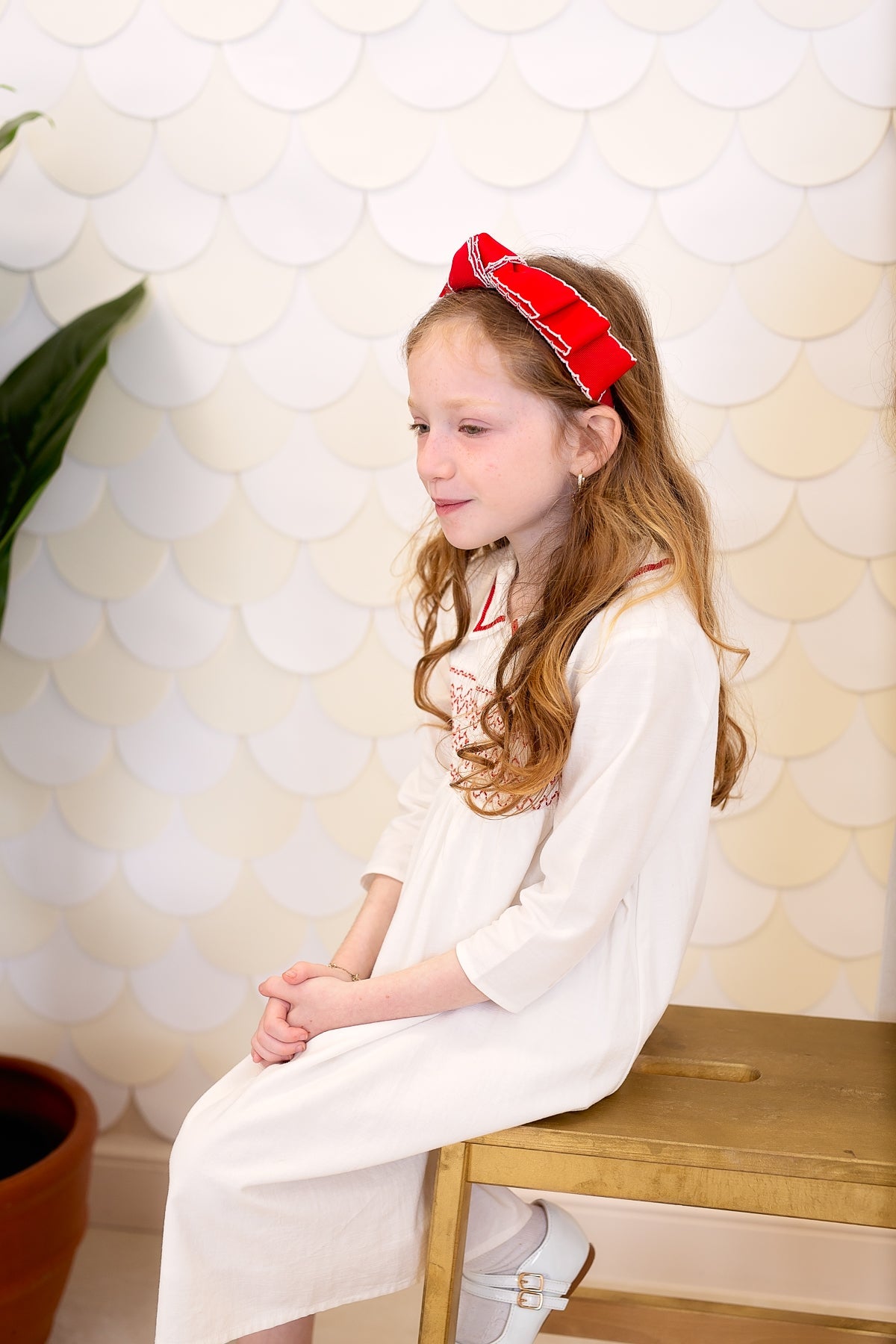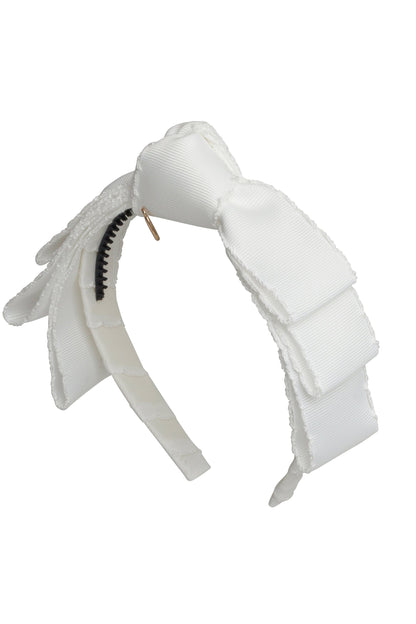 This headband brings together two beloved designs—the structured layers of our Heather Headband and the effortless elegance of a classic knot. Made from grosgrain ribbon with delicate moon-stitched edging, it features a a triple layer bow with a knot at its center.