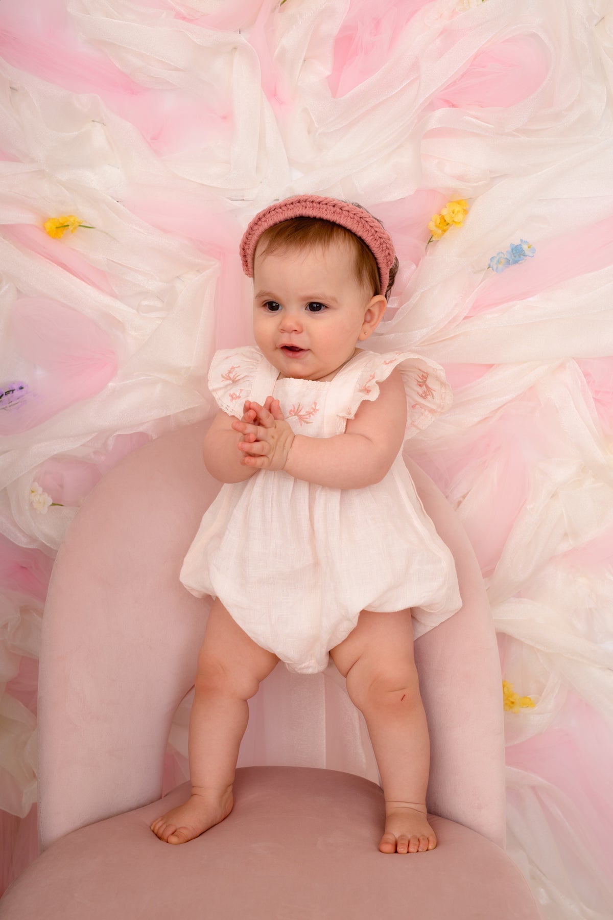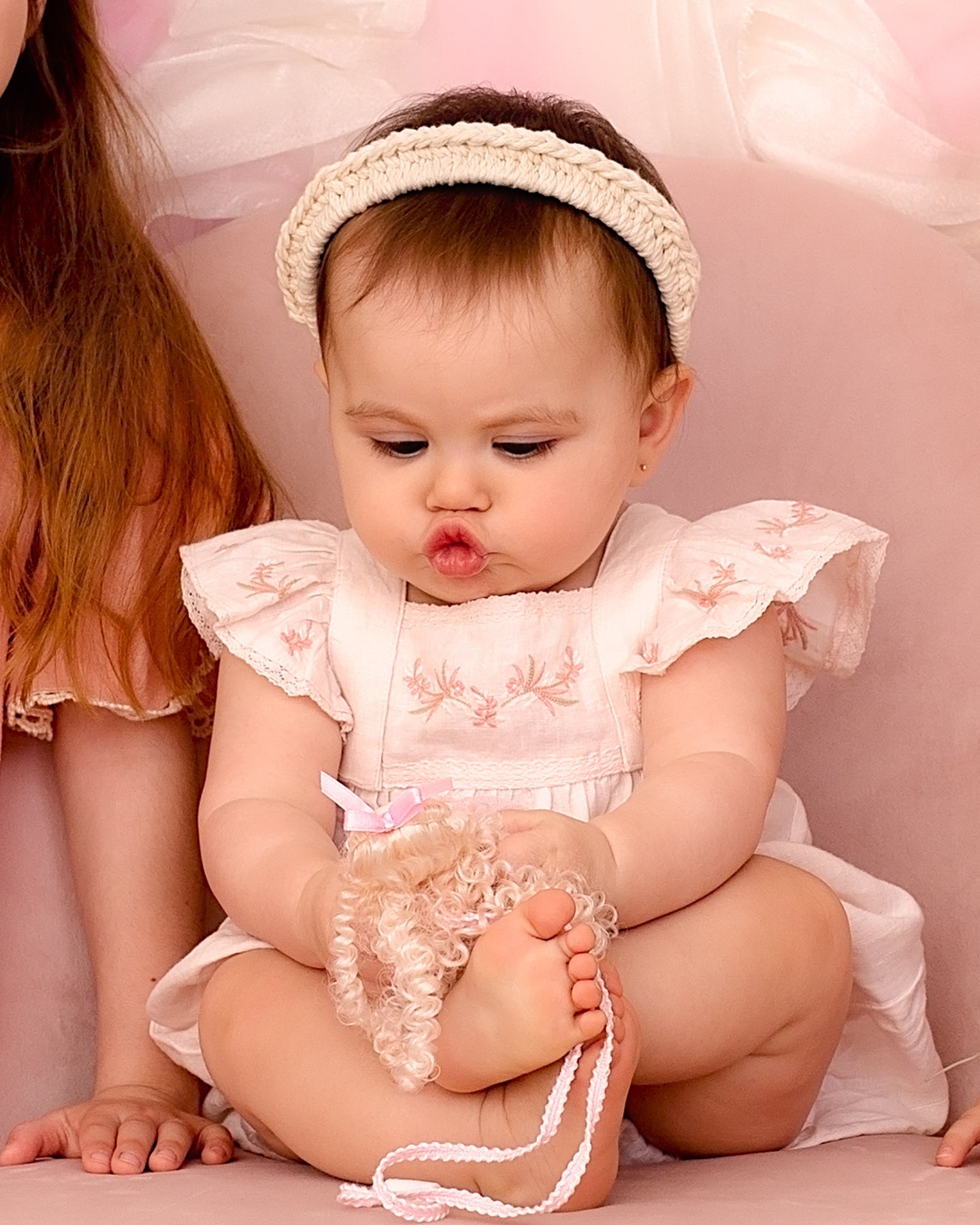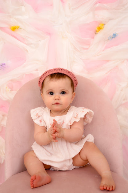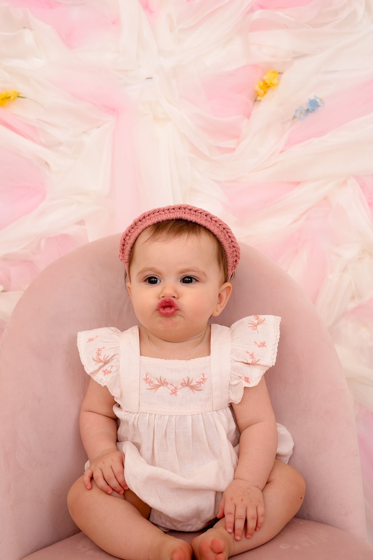 To say we spent a lot of time sourcing the right threads for this style would be an understatement! In the end, we settled on two different threads and choose colors from both of them. We sourced the threads in Mexico and Brazil. Then, we had each of these macrame styles handmade by women in Colombia. The Links styles come in a hard headband and also a baby adjustable wrap. Our wraps can fit baby all the way to adult, though! The baby pictured is 10 months old.