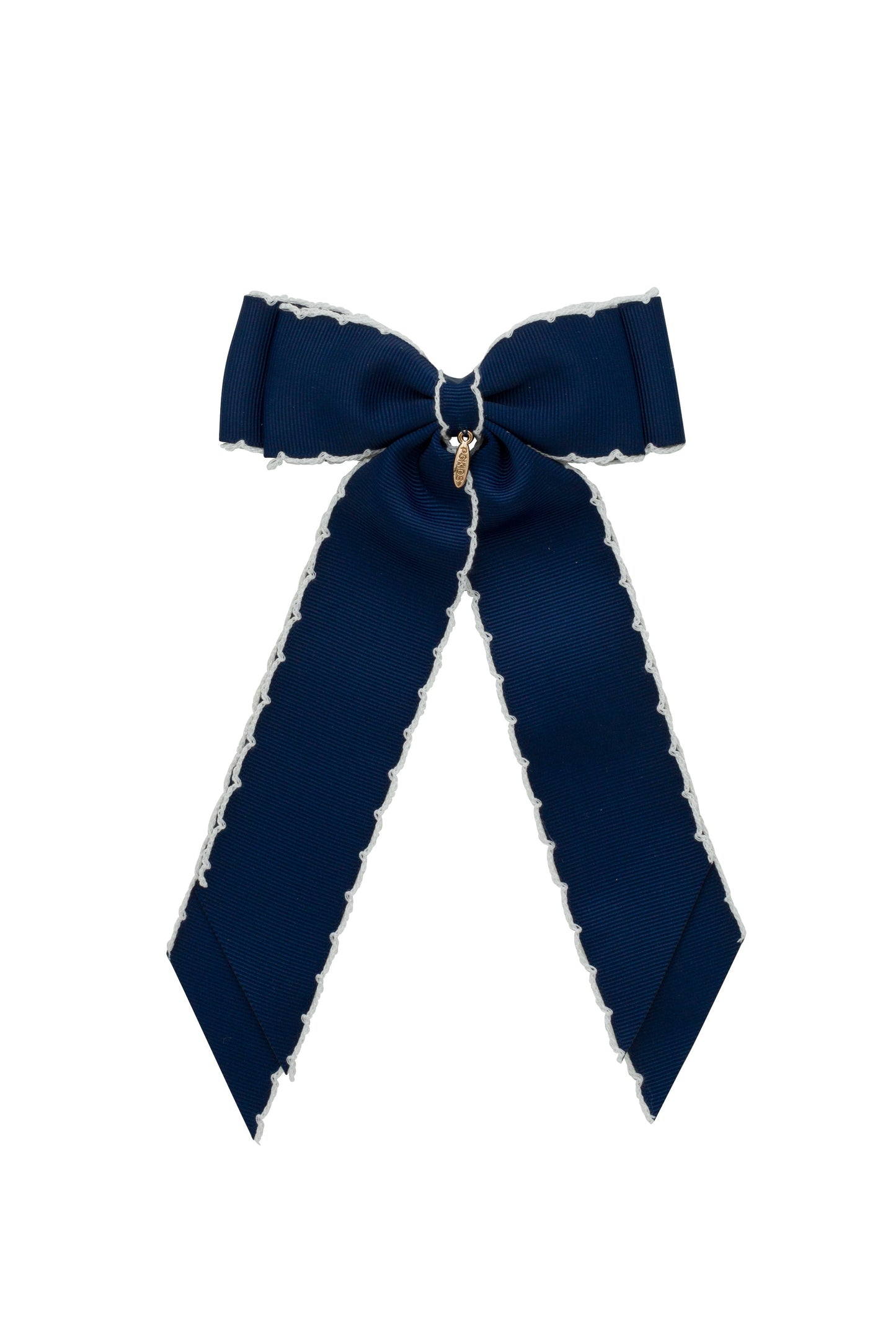 Classic and charming, the Madeline Moonstitch Small Clip is a beautifully crafted bow featuring grosgrain ribbon with delicate moon-stitched edging. Its structured shape and flowing tails create a polished yet playful look, making it an effortless addition to any hairstyle.