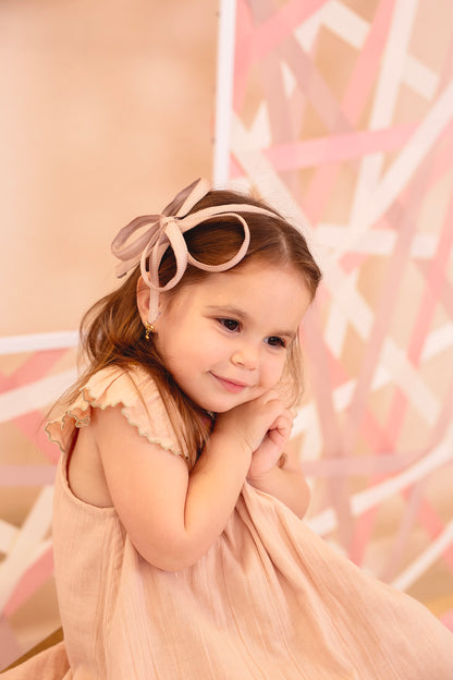 Is it a bow or a flower or a butterfly? Well, that's up to you! This unique headband has a sturdy flat "wire" going through it so you can move the loops to create a bow or a butterfly or maybe an orchid! It will arrive looking like a double bow. While it might seem like a super large headband, it actually isn't so big looking when it's on! We even let our almost 3-year-old model try it! Look how cute it is!!