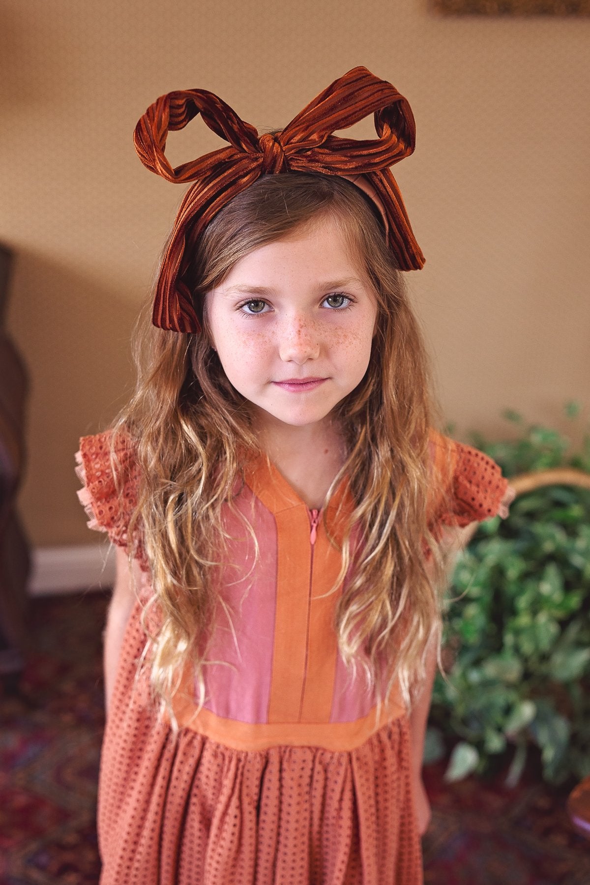 A classic style for us, we remake it for you again and again in new fabrics and colors. This season, we used our new velvet stripe fabric. It adds so much to this style! AND, new for this season, we designed a small matching ADORABLE clip!
