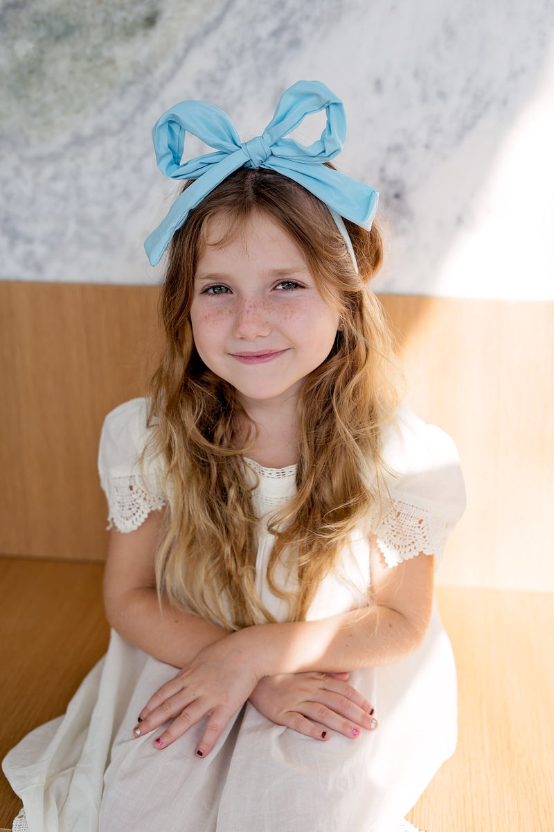 Wire loops covered in taffeta forming a bow on an adjustable wrap.