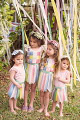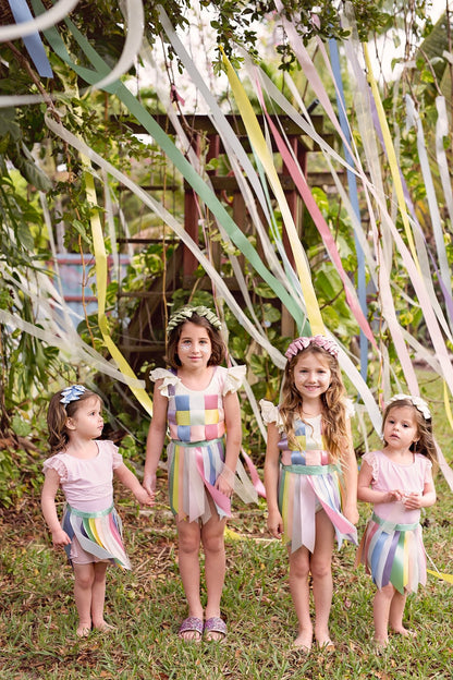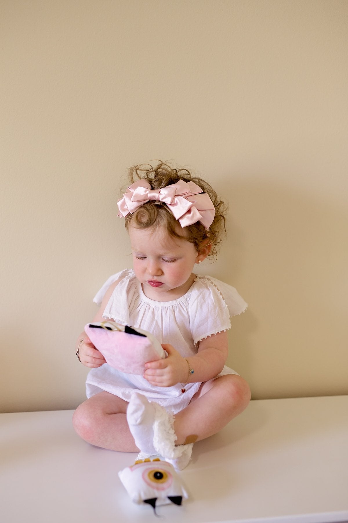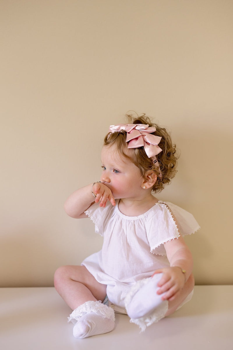 Layers of satin folded and sewn to create a cascading pleated look on an adjustable wrap.