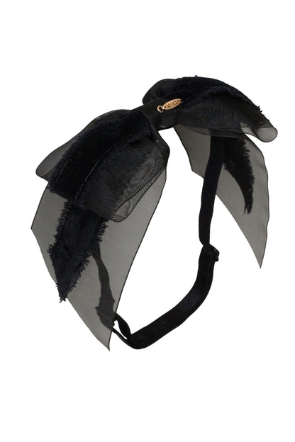 A stunning bow inspired adjustable hair wrap with organza and a velvet-like material with fringe. It's a piece of art, you'll see!