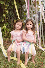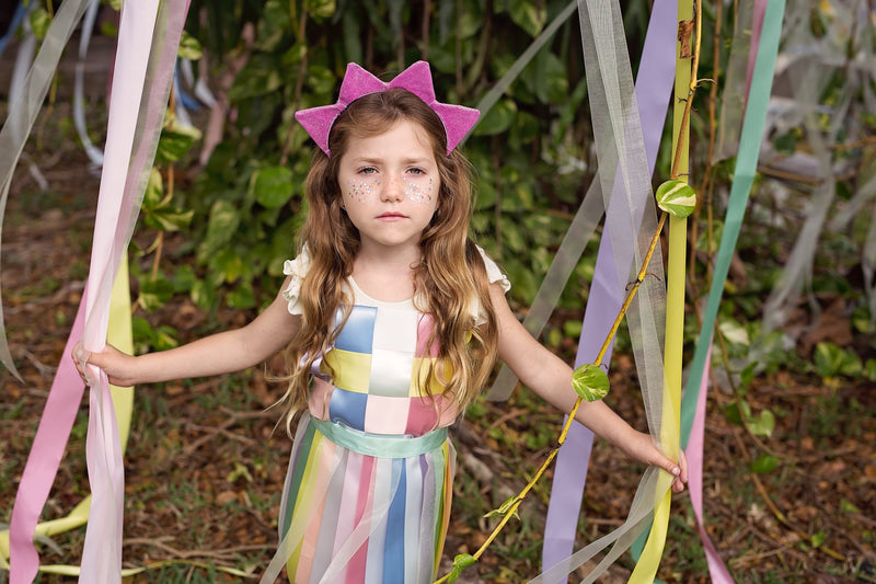 Two sparkle bows on a hard headband forming a crown look. Alternatively, 4 glitter traingle rays on a hard headband.