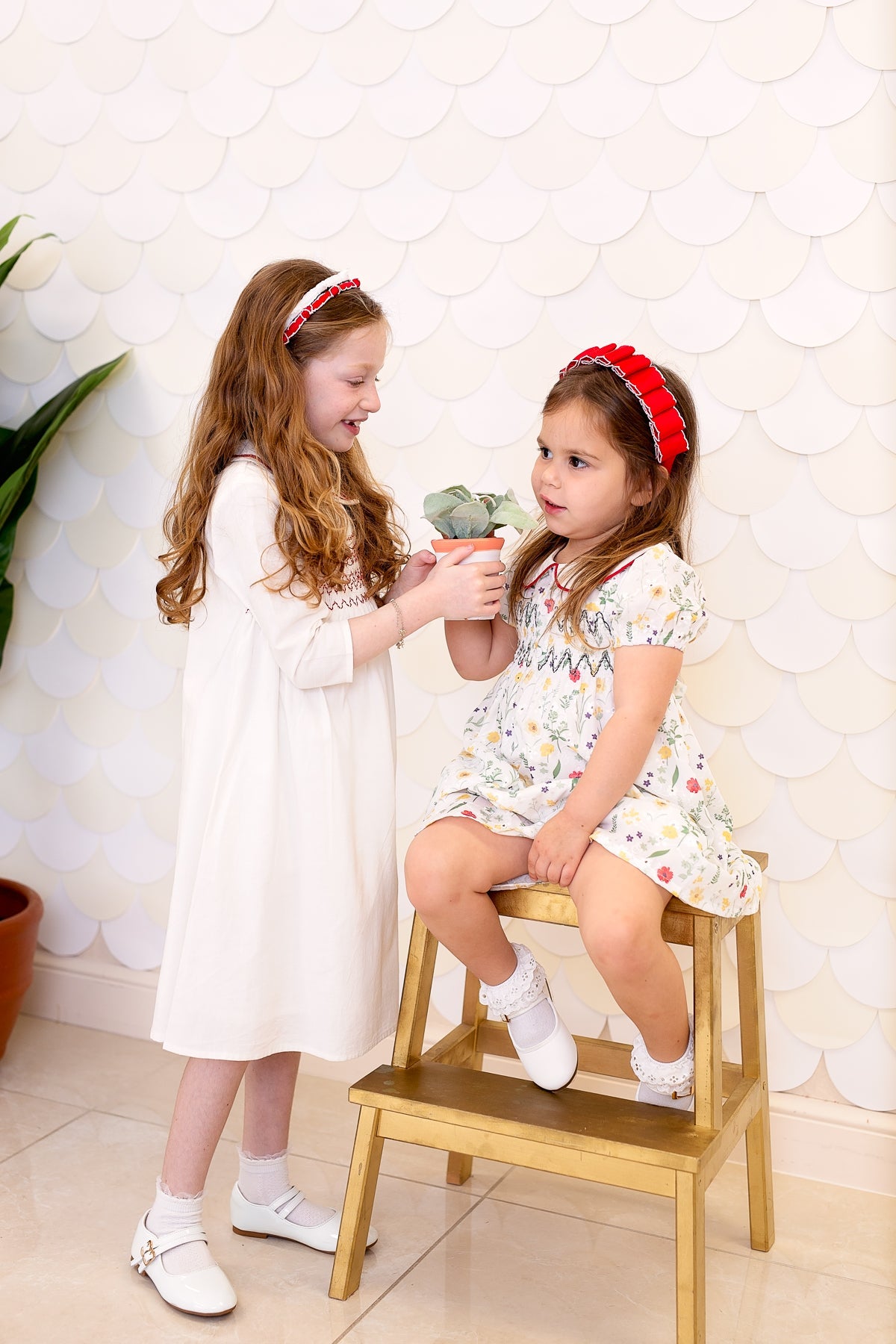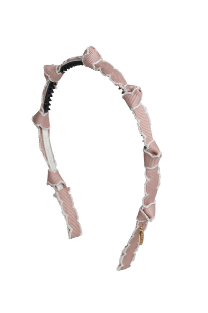 Our popular Rosebud Headband, now in our new unique moon-stitched edged grosgrain ribbon. This version brings an elevated feel to a beloved silhouette, offering a blend of artistry and sophistication.