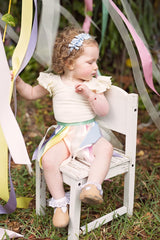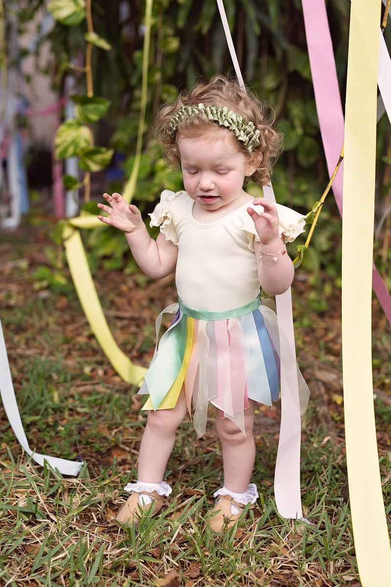 Strips of satin knotted and placed around an adjustable wrap. Perfect for baby or girls.