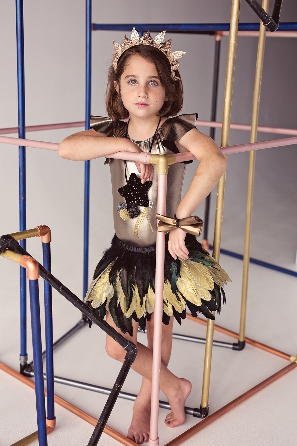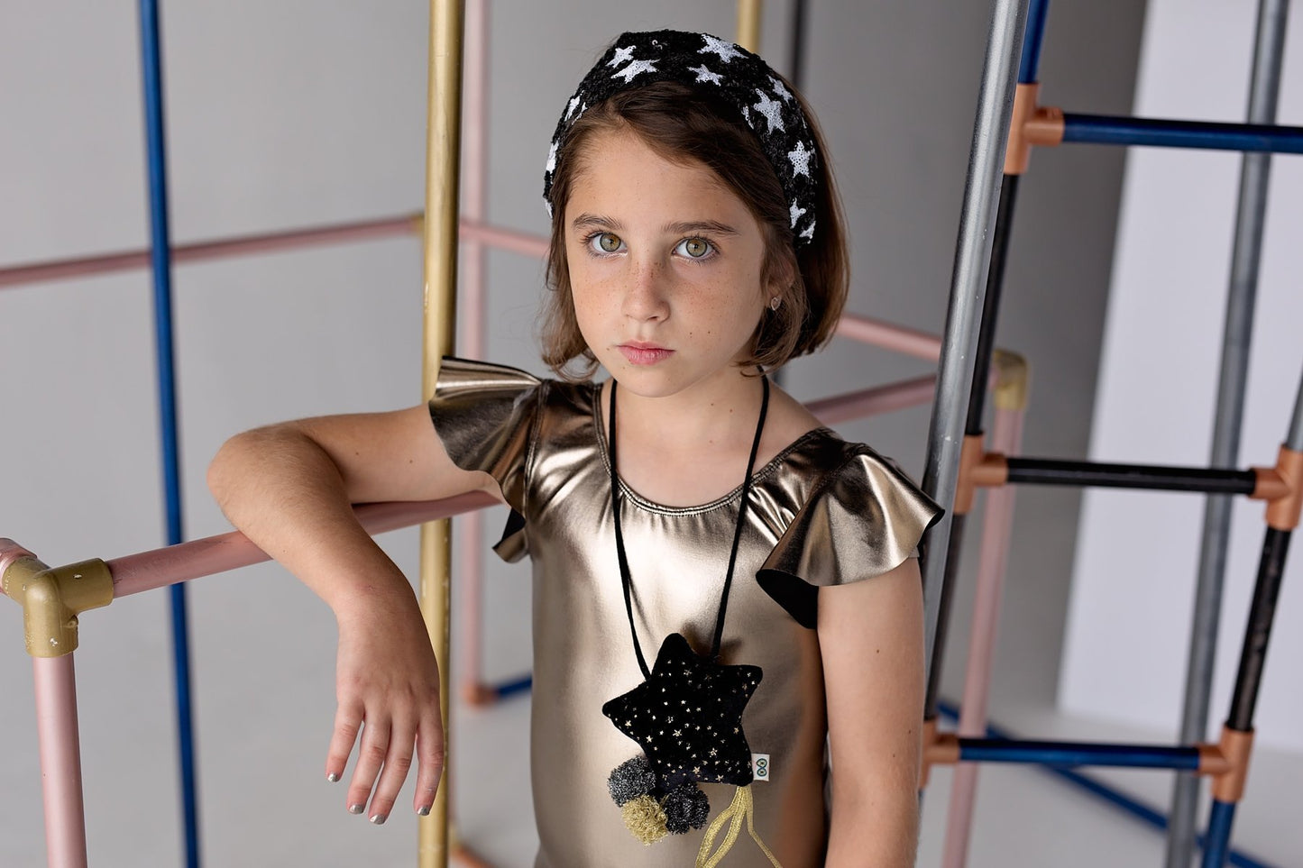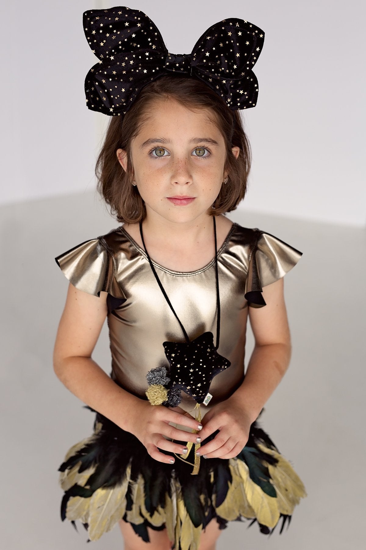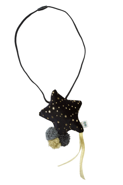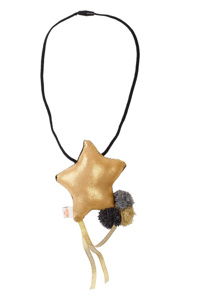 A plush star necklace with 3 tulle pom poms and gold ribbons. One side of the star has velvet black fabric with gold stars and the other side is a gold fabric.