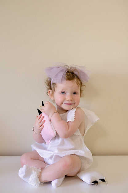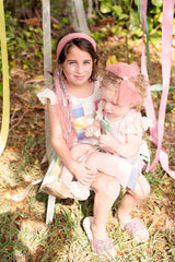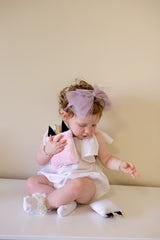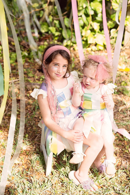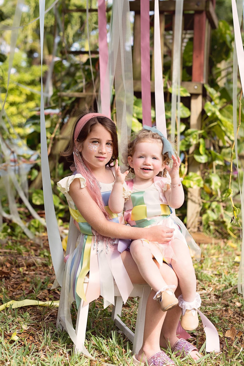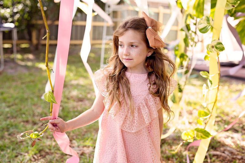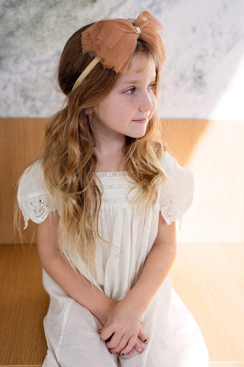 Strips of Tulle with a string of sequins in the center creating a soft bow. The bow has a clip that can be attached to an adjustable wrap.