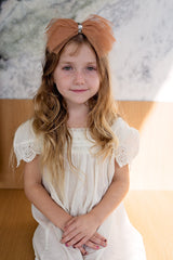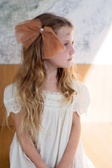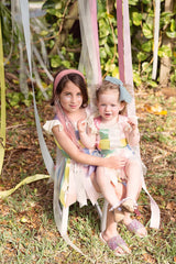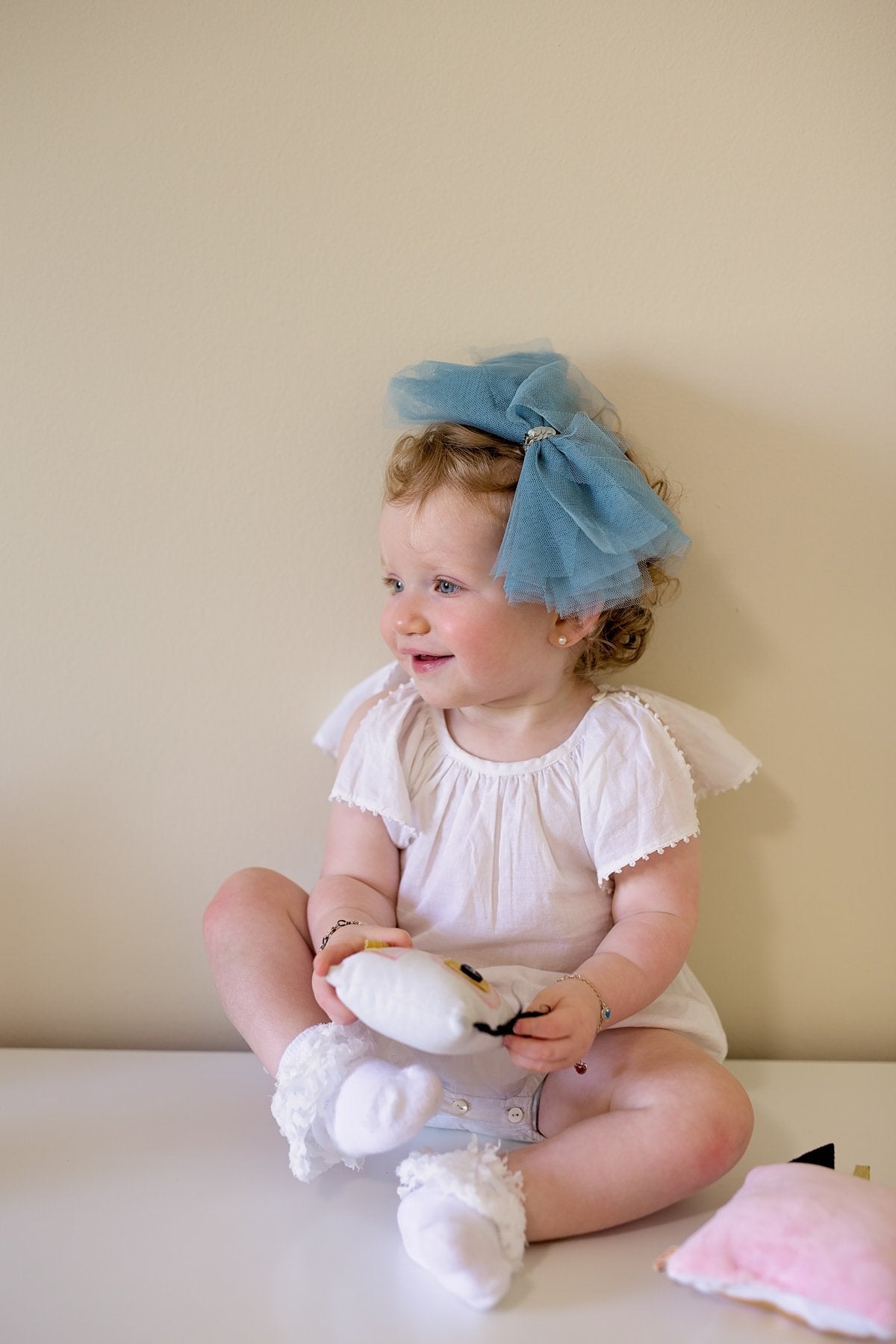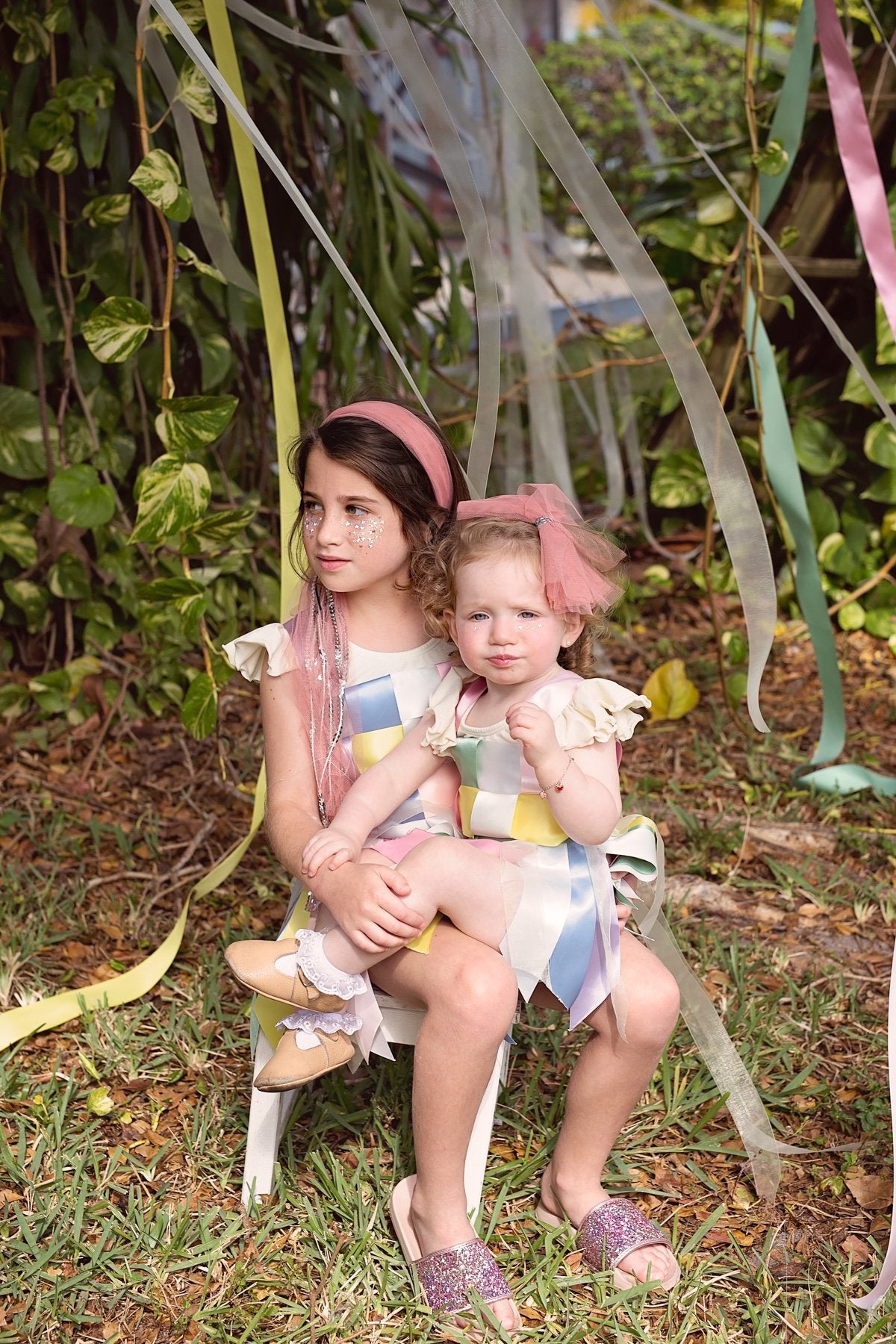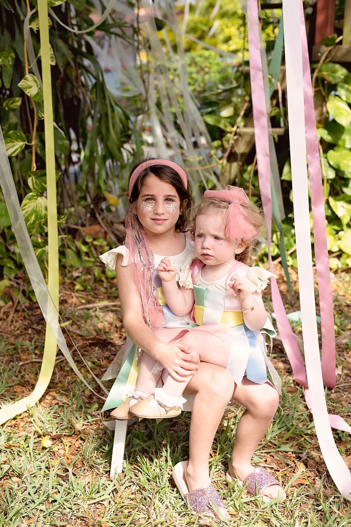 Strips of Tulle with a string of sequins in the center creating a soft bow. The bow has a clip that can be attached to an adjustable wrap.