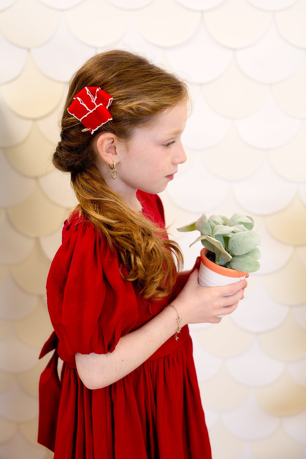 A petite yet striking piece, the Spanish Dancer Clip is the perfect finishing touch to any look. Designed to match our Spanish Dancer Headband and Wrap, this handmade clip features layered grosgrain ribbon with moon-stitched edges, carefully sewn and shaped for a sculpted, dimensional effect.