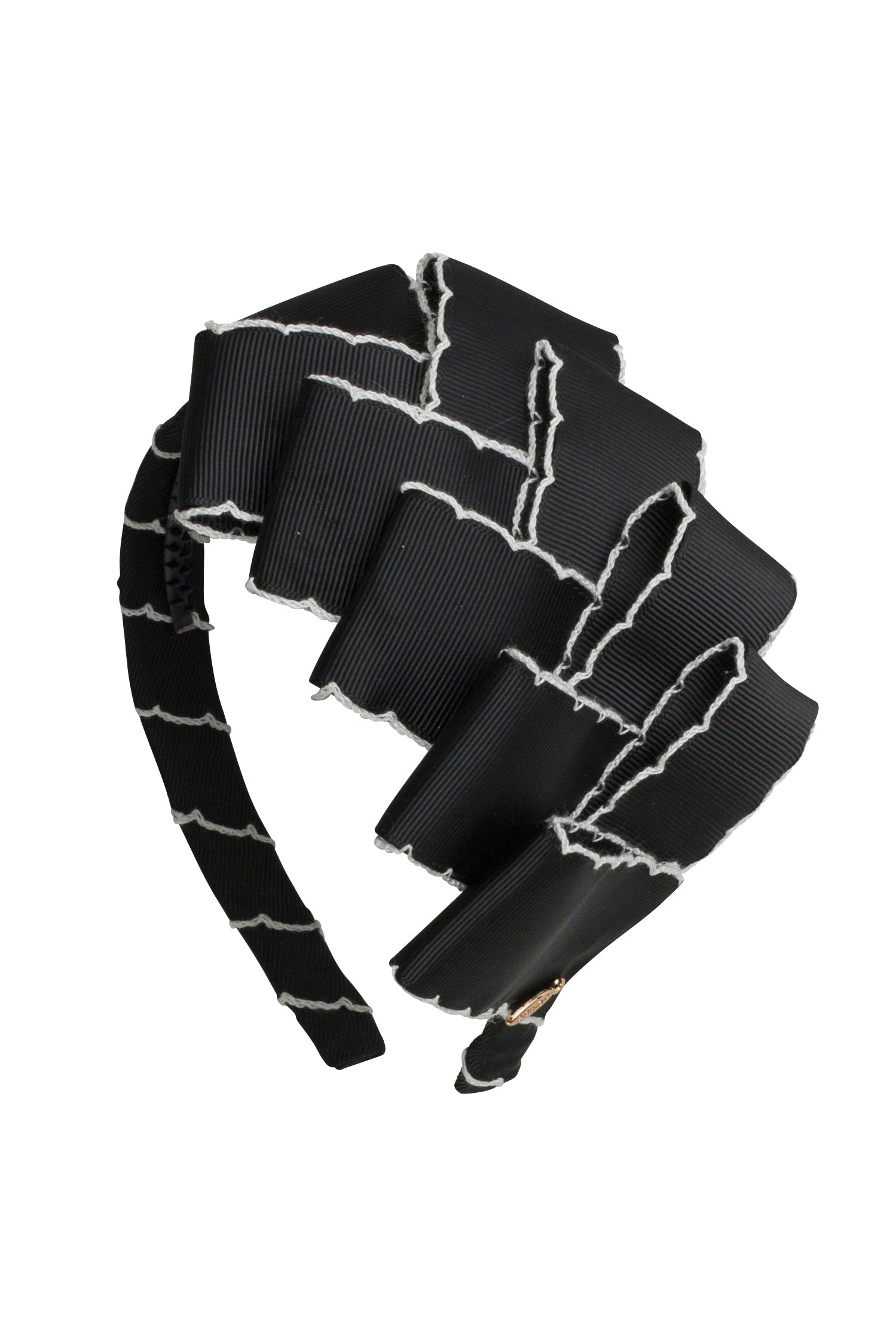 Bold, beautiful, and effortlessly chic—this handmade headband is designed to make a statement. Crafted with care in our South Florida design space, it features grosgrain ribbon with moonstitched edging, meticulously sewn before being sculpted into a dramatic layered design. The result? A head-turning accessory that blends classic charm with modern flair.