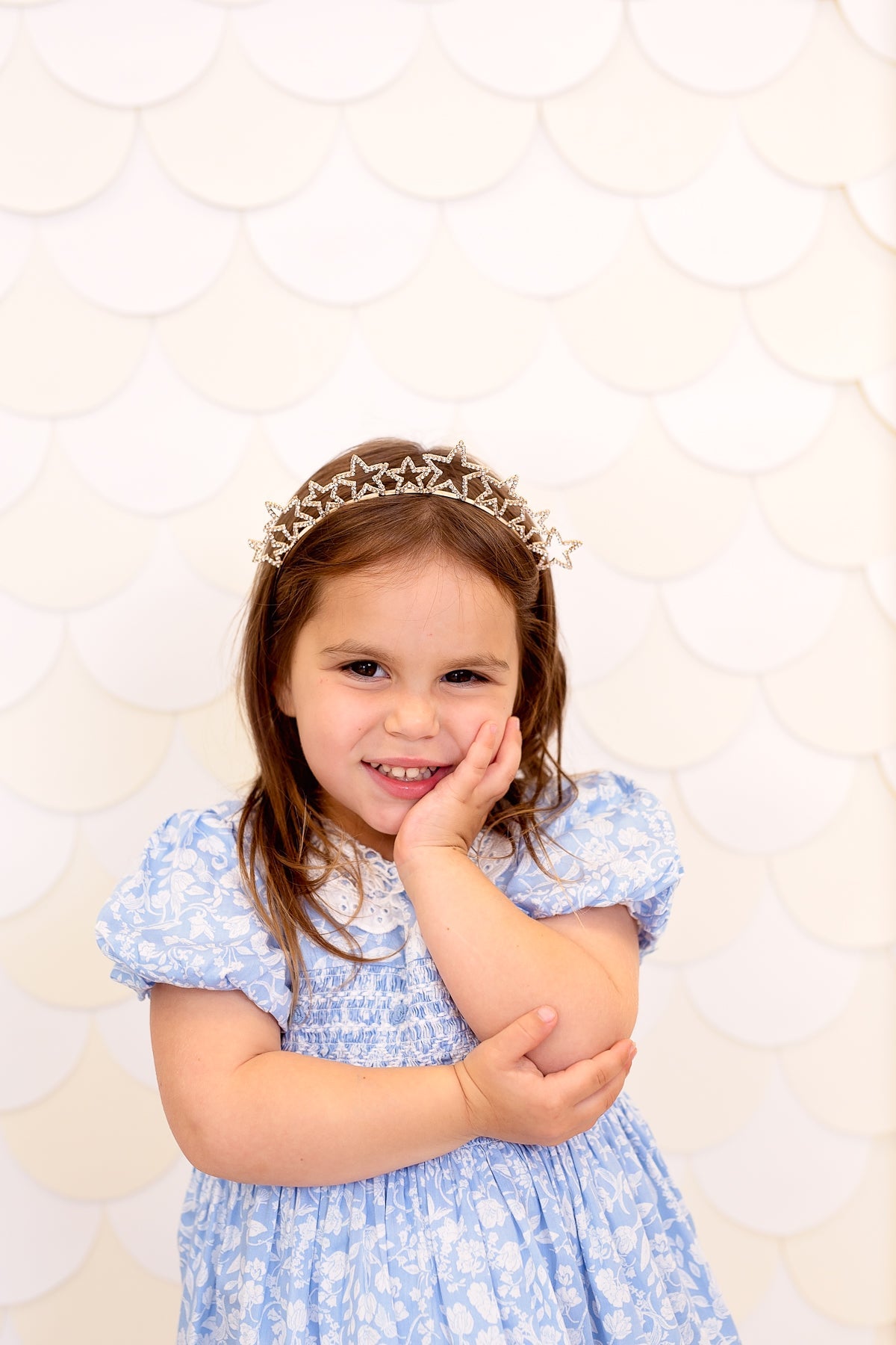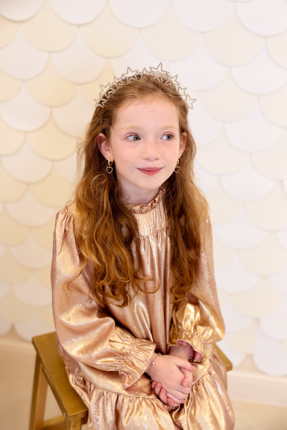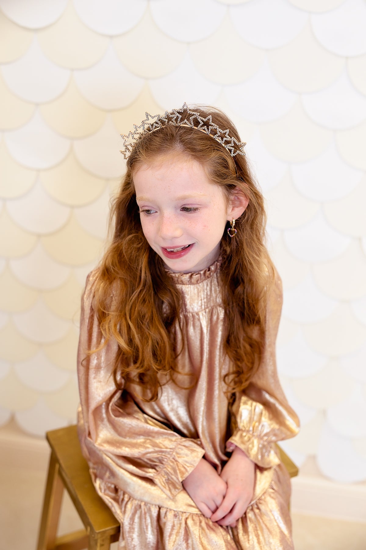 Light and airy yet full of sparkle, she is designed to feel like a celestial crown. A delicate gold band is adorned with twinkling crystal stars, creating a weightless, dreamy effect. Whether it’s for a special occasion or just to add a little magic to the everyday, this headband brings a touch of stardust to any look.