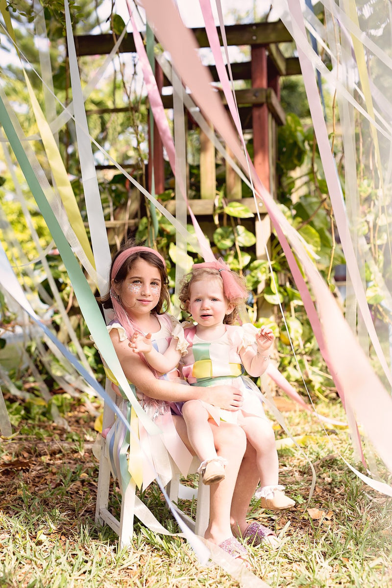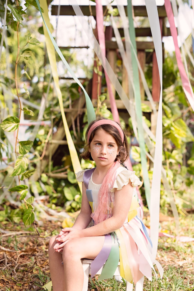 A tulle wreath/wrap made with layers of tulle. The adjustable closure has ribbons, sequins, and strips of tulle dangling.