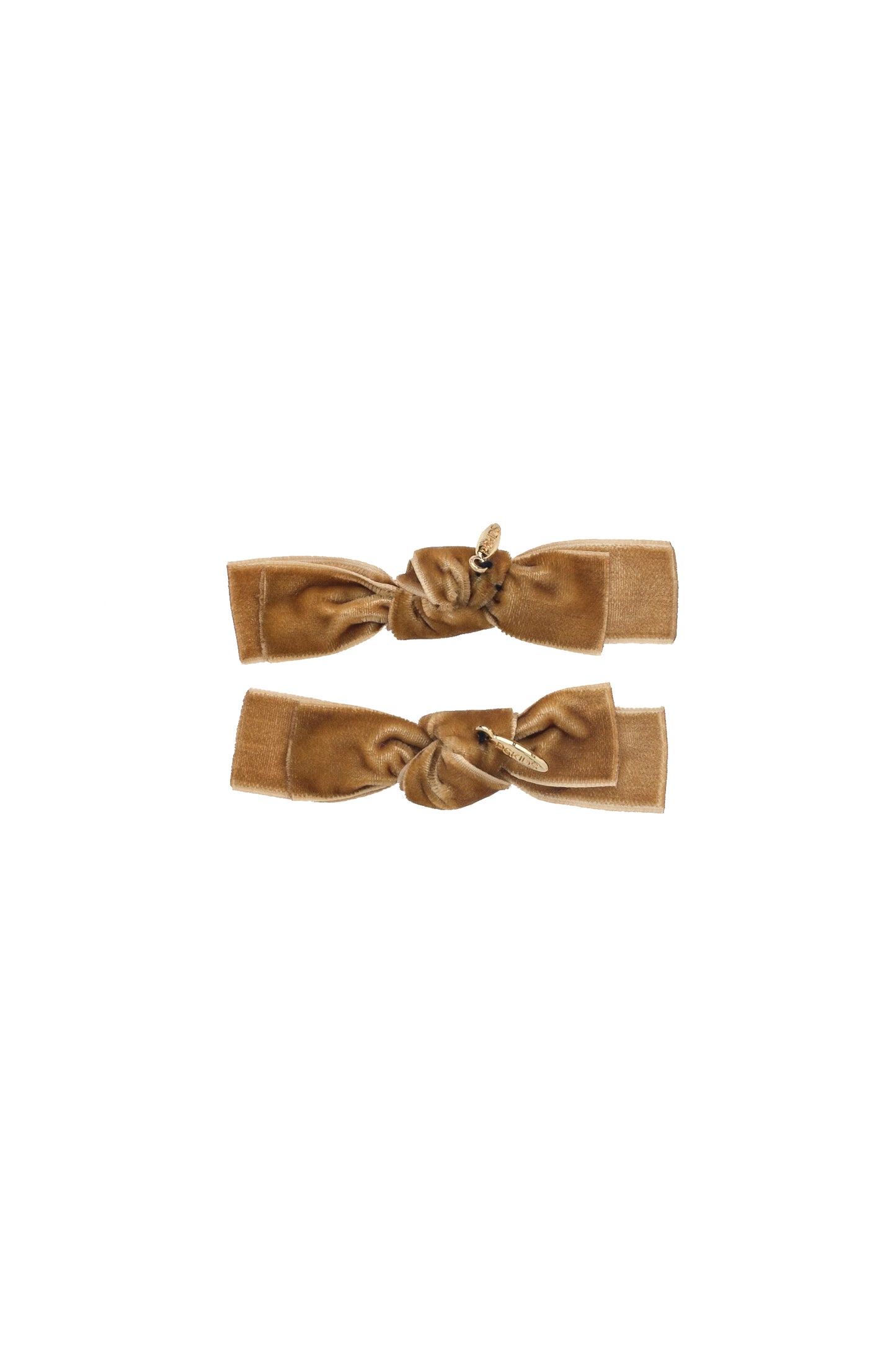 Two layers of beautiful velvet ribbon formed into a simple bow with a knot center. Wear them next to each other or as piggy clips! Each clip is about 3" wide.