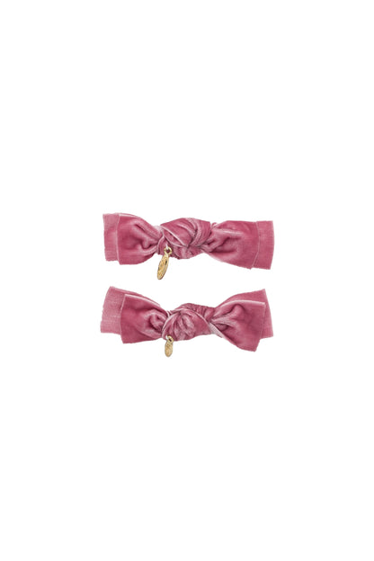 Two layers of beautiful velvet ribbon formed into a simple bow with a knot center. Wear them next to each other or as piggy clips! Each clip is about 3" wide.