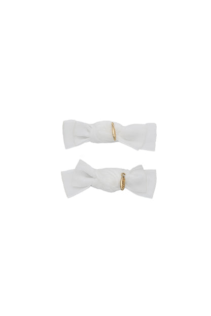 Two layers of beautiful velvet ribbon formed into a simple bow with a knot center. Wear them next to each other or as piggy clips! Each clip is about 3" wide.